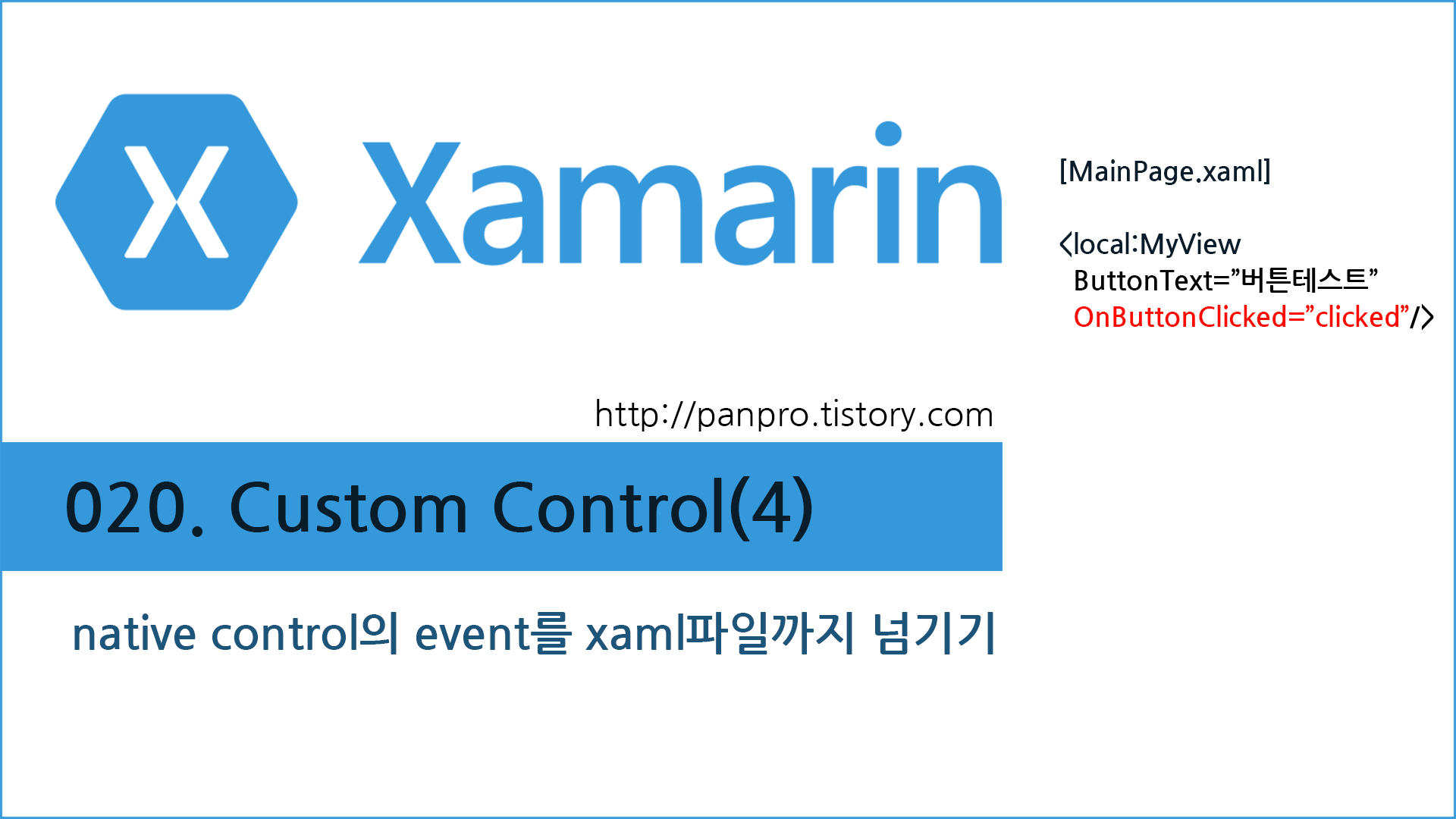 여기까지 하시면 우리가 원했던, xaml 파일에서 native control에 속성값을 전달하고, native control에서 발생한 event를 .xaml.cs 파일에서 처리할 수 있게 됩니다.