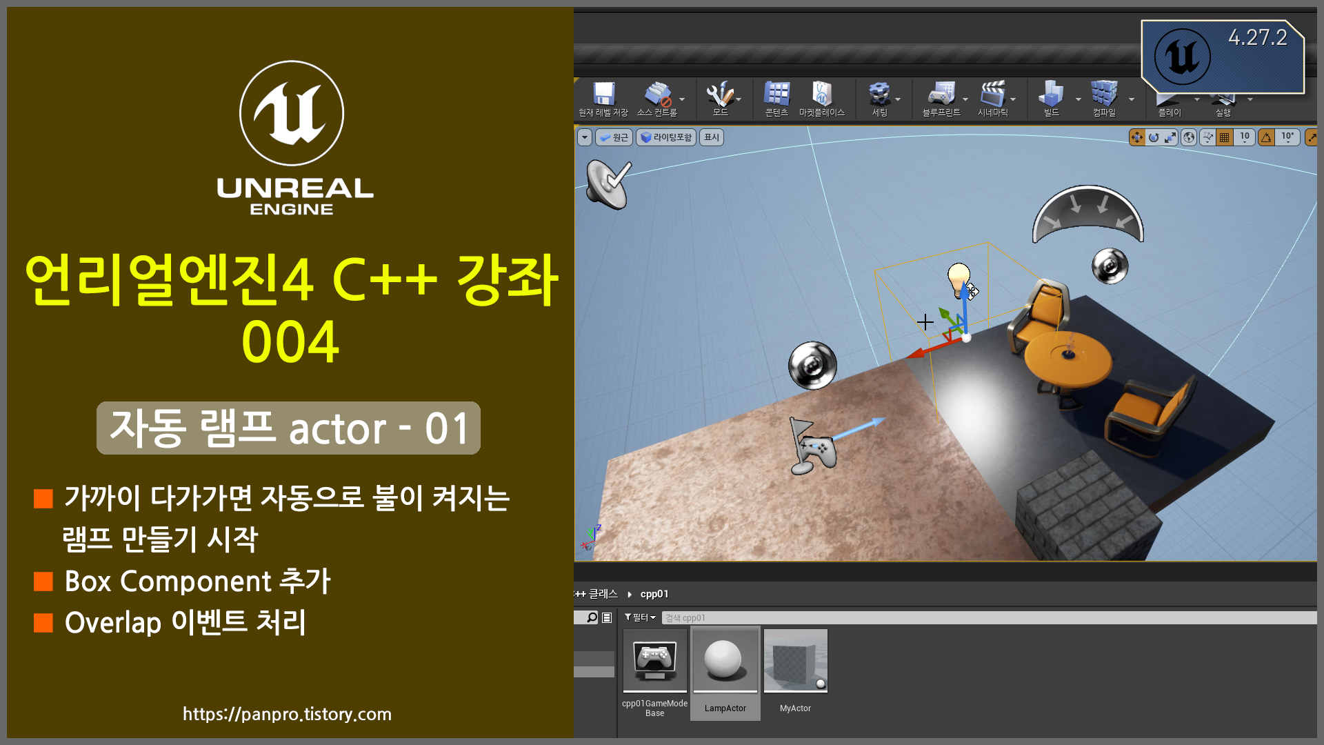 가까이 다가가면 자동으로 불이 켜지는 램프 액터를 만들어 봅니다.