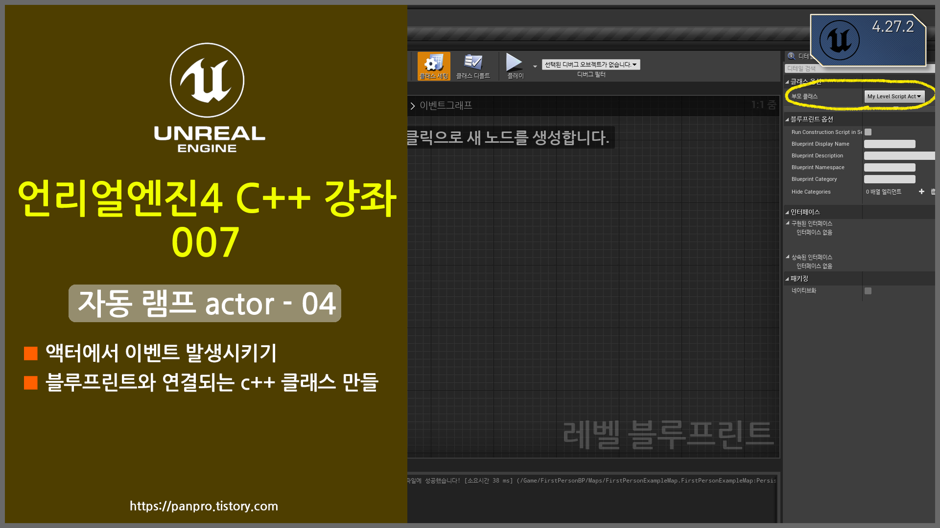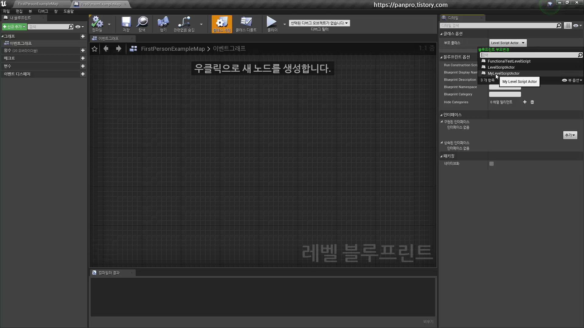 그리고 레벨블루프린트에 연결되는 MyLevelScriptActor를 만들어 램프 액터에서 발생하는 이벤트를 받아 처리합니다.