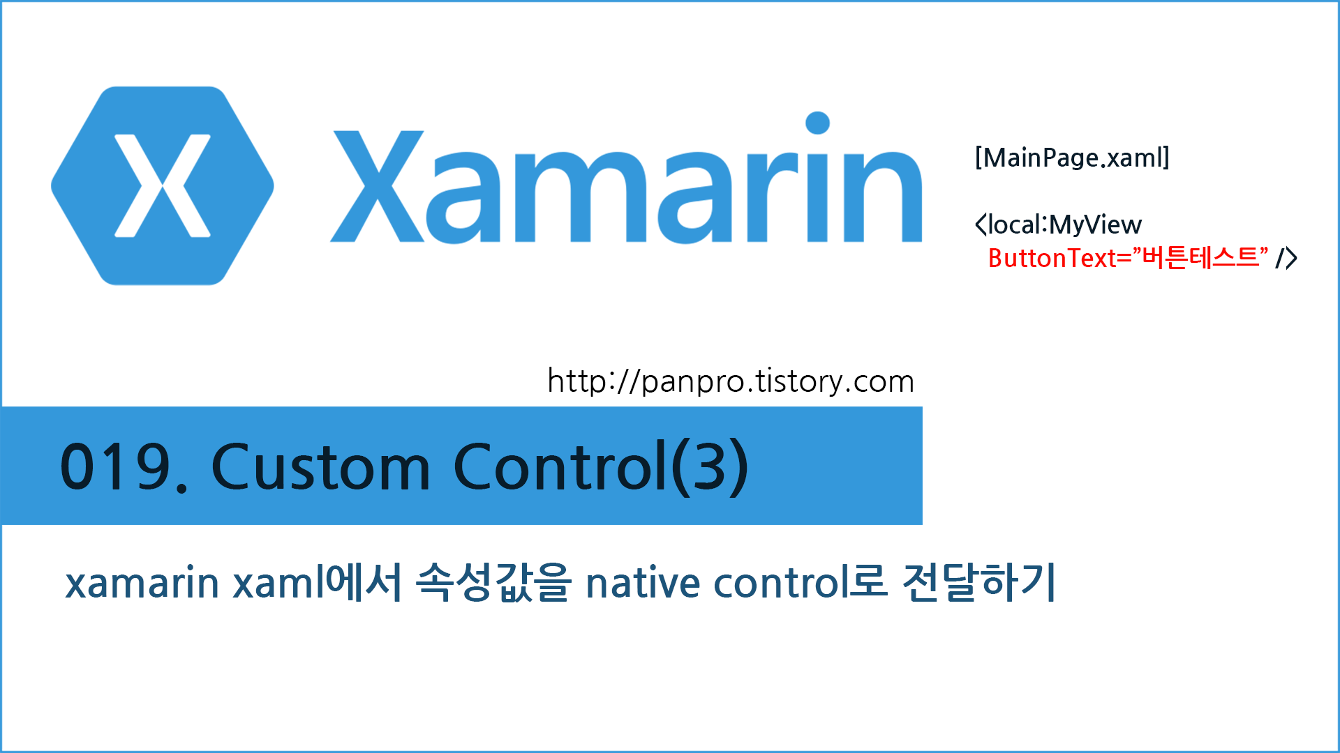 xamarin 19번째, xamarin에서 Custom Native Control 만들기 3번째 시간으로, xamarin의 공통영역의 xaml 파일에서 속성값을 native control로 전달하는 방법을 설명합니다. xaml 파일에서 속성값을 정하면 그 값으로 초기화하겠다는 뜻이죠. 그렇게 값을 초기화할 때 제대로 값이 넘어가는 방법을 알아봅니다. OnElementChanged() OnElementPropertyChanged() renderer에서 위 두 함수를 override 해서 사용해 xaml 파일에서 설정한 값을 native control로 전달합니다.